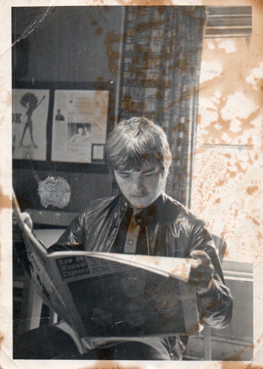 Reading the NME (New musical Express) – a poster of IT (International Times) in the background.